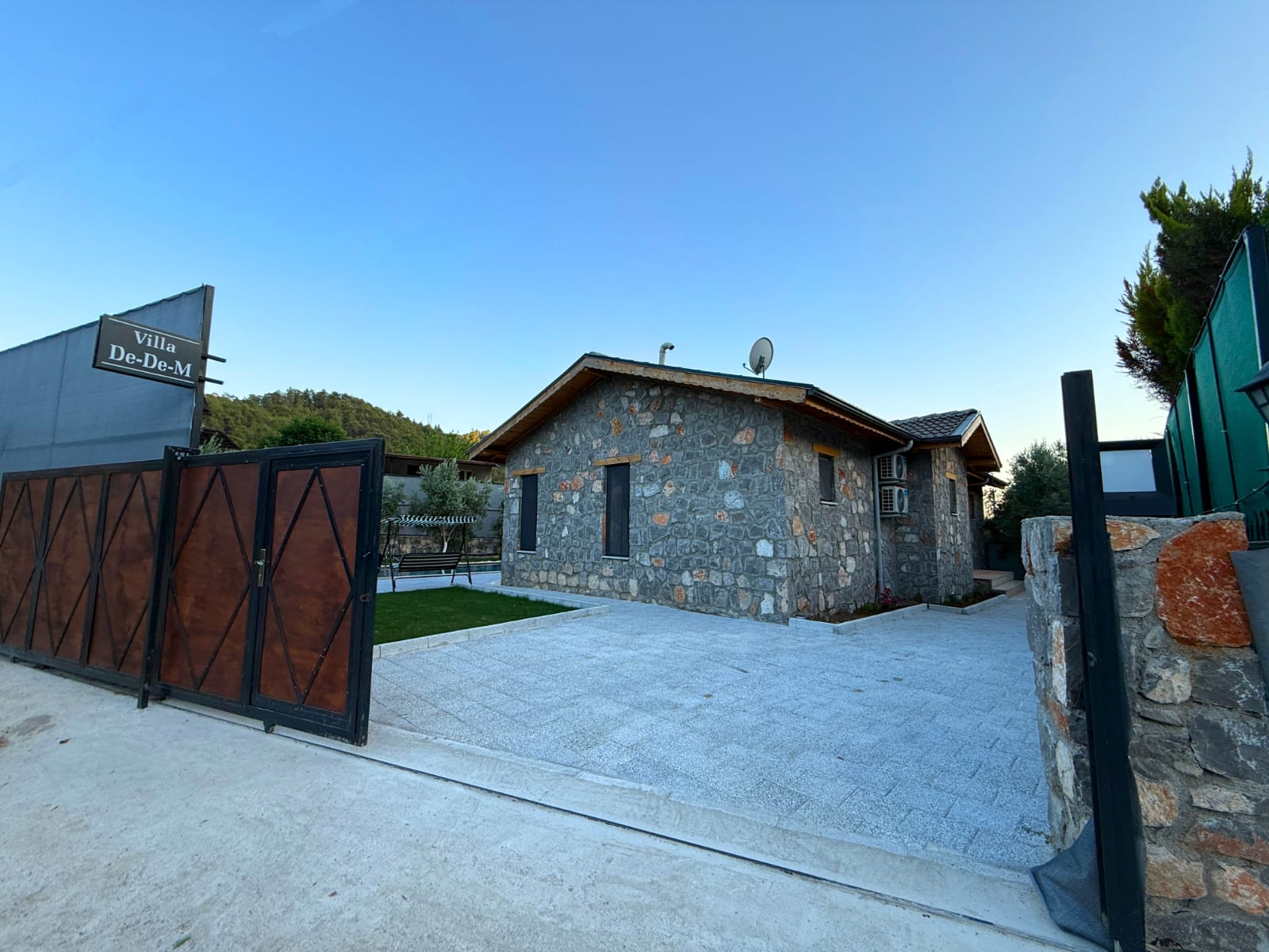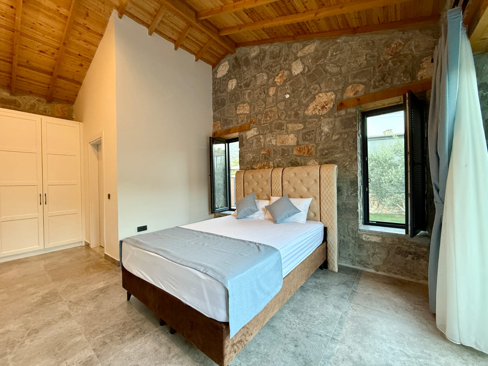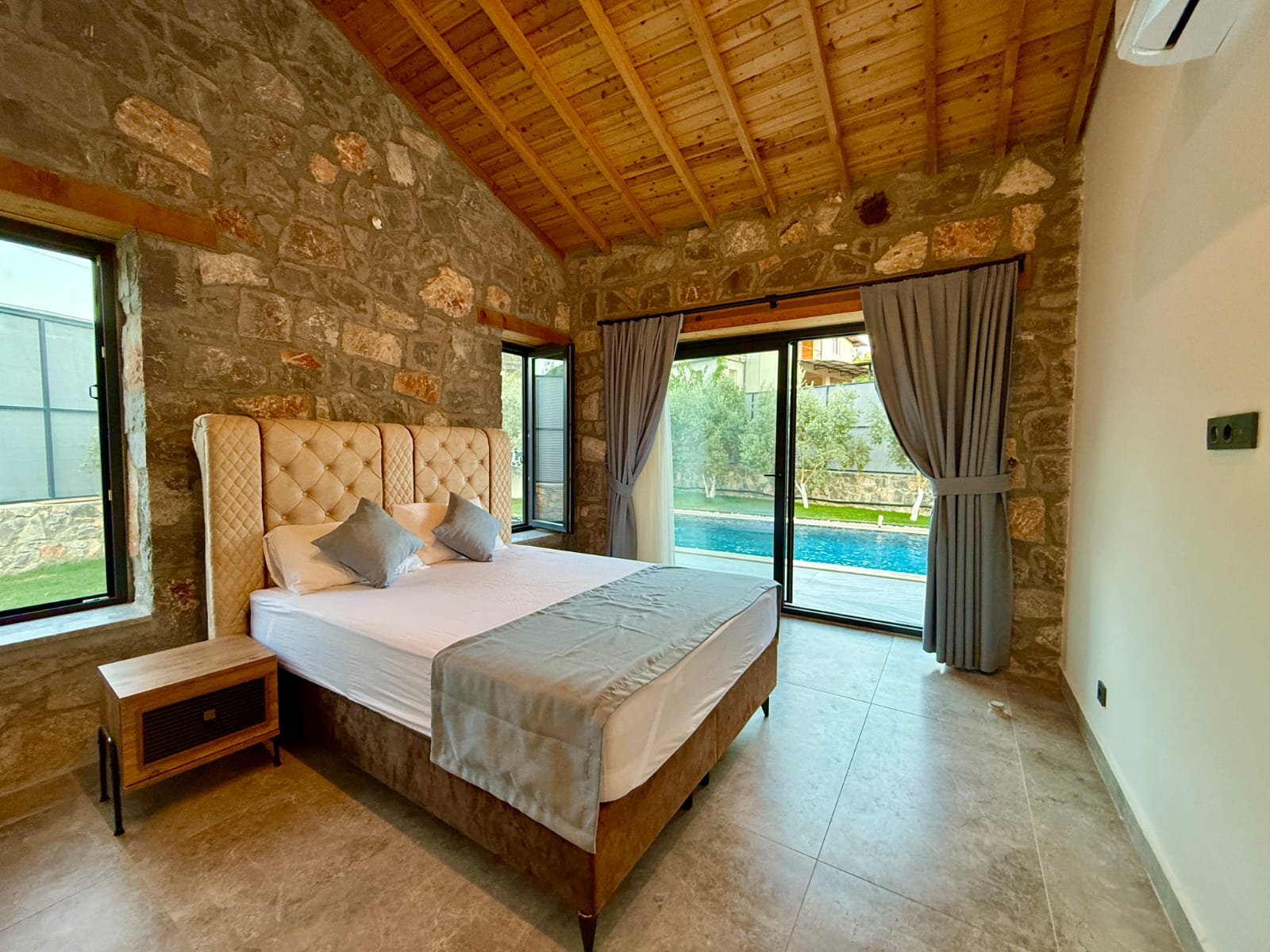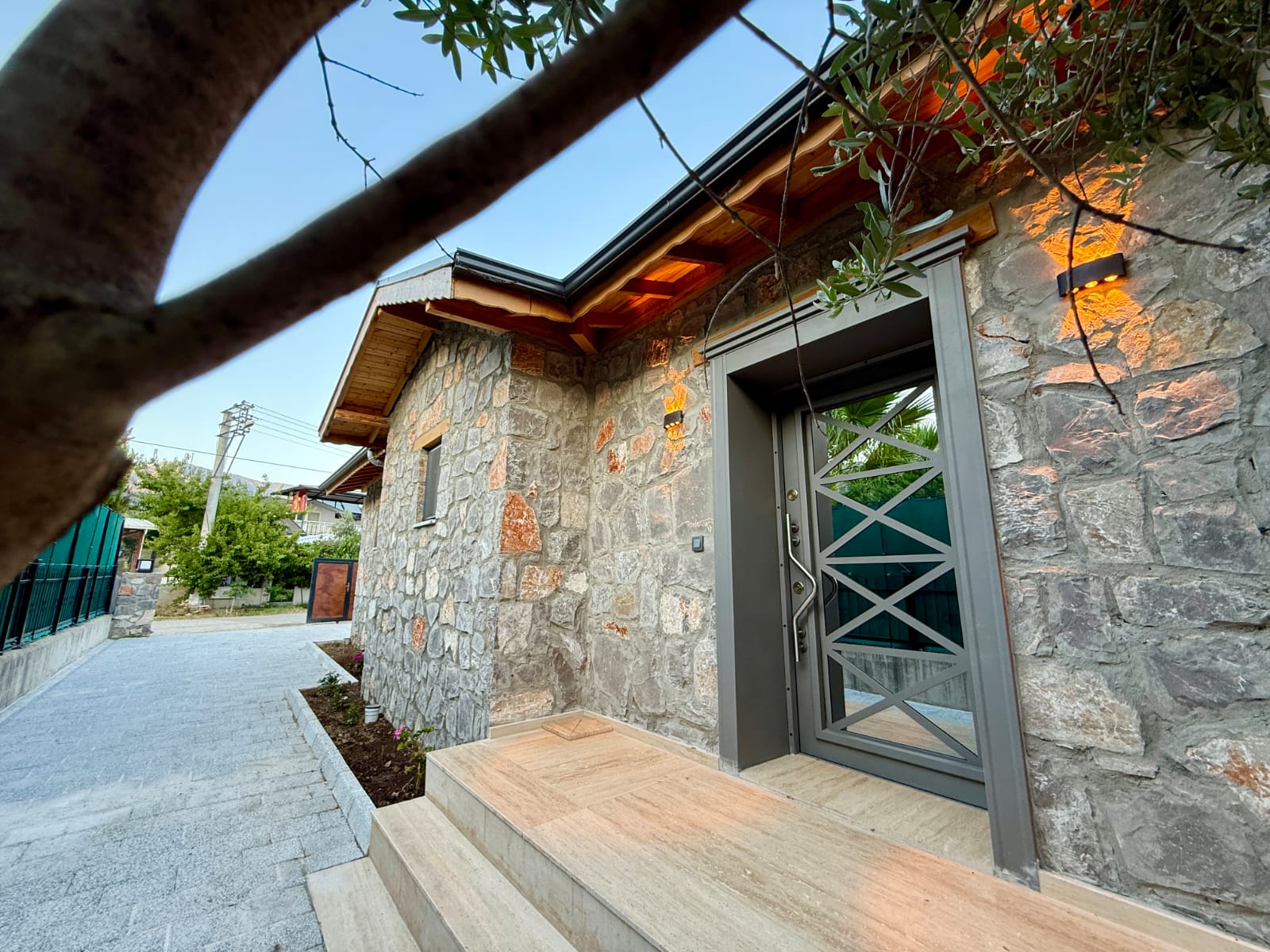 Villanın en dikkat çekici özelliklerinden biri, tamamen taş yapıdan oluşmasıdır. Doğal taşın sağladığı serinlik ve sağlıklı yaşam alanı, ahşap detaylarla birleşerek hem estetik hem de huzurlu bir atmosfer yaratır. Bu özel mimari, villaya karakteristik ve sıcak bir ambiyans kazandırmaktadır.