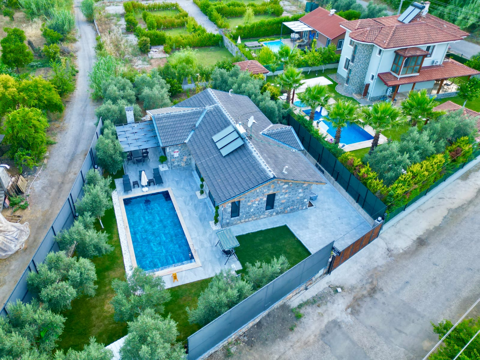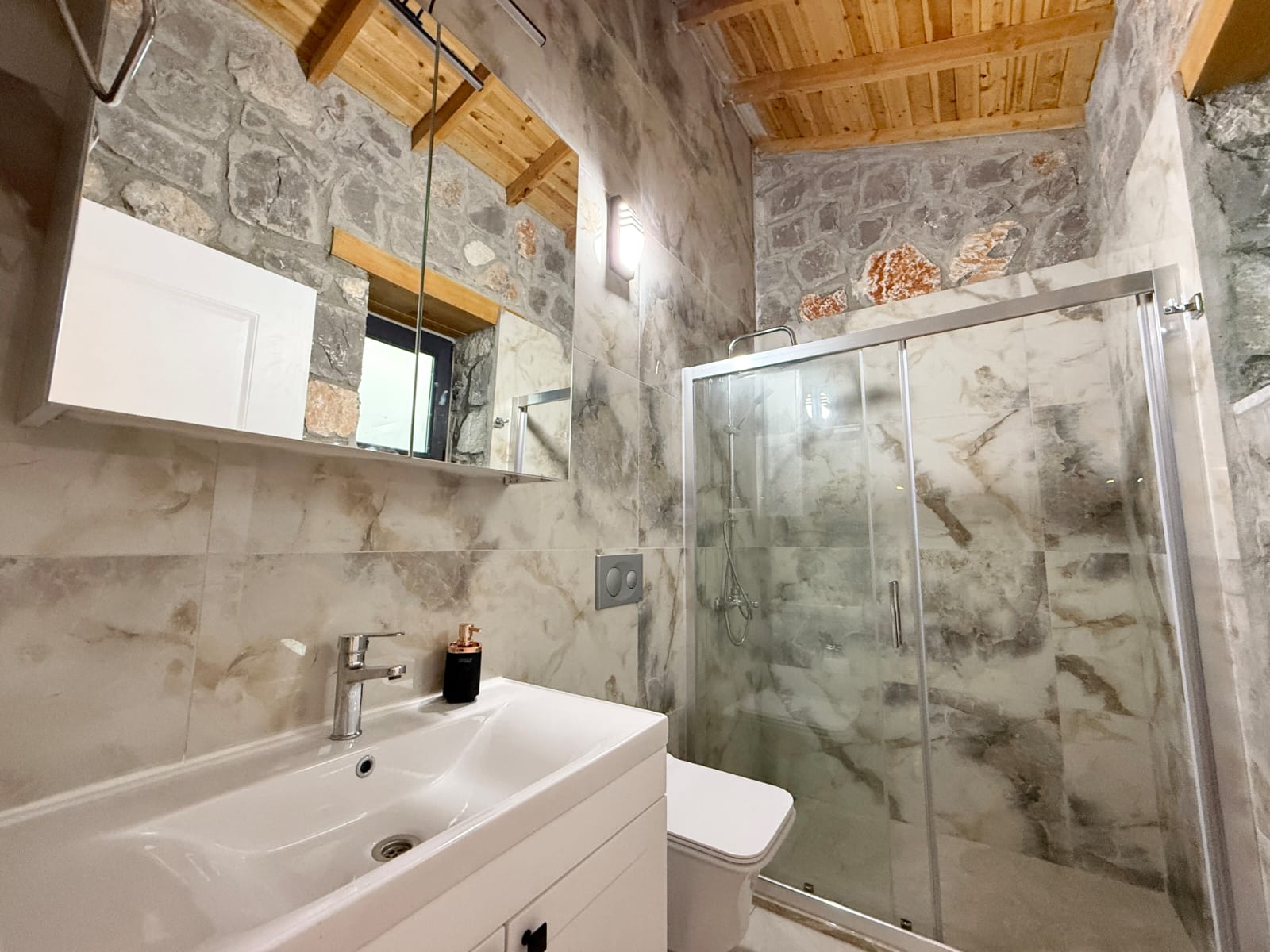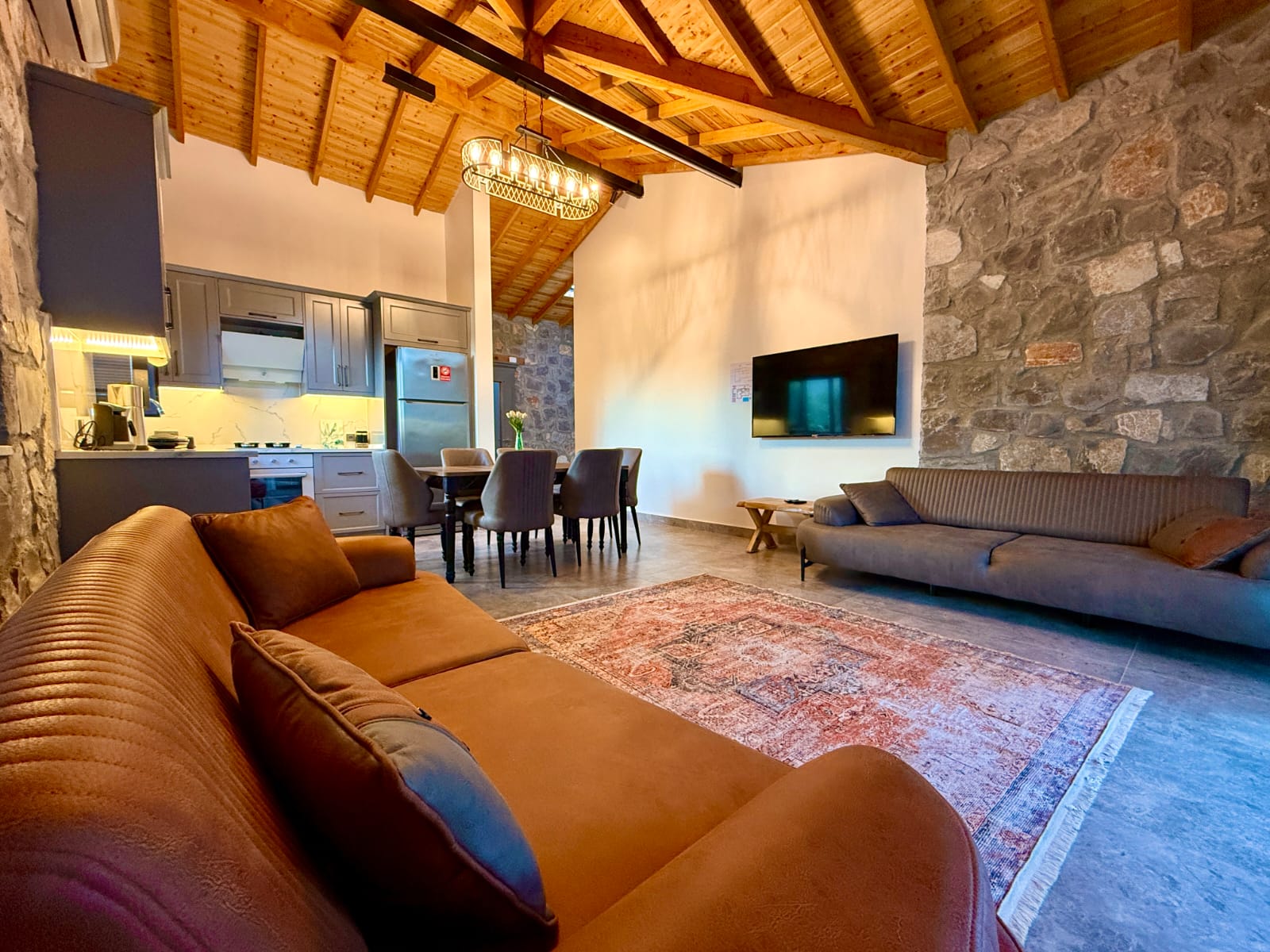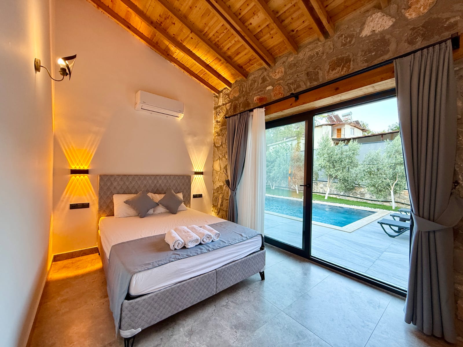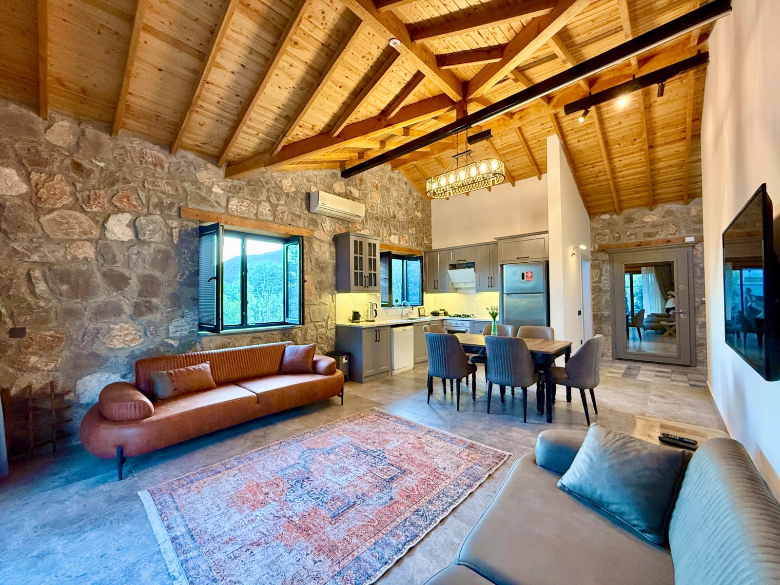 Villanın en dikkat çekici özelliklerinden biri, tamamen taş yapıdan oluşmasıdır. Doğal taşın sağladığı serinlik ve sağlıklı yaşam alanı, ahşap detaylarla birleşerek hem estetik hem de huzurlu bir atmosfer yaratır. Bu özel mimari, villaya karakteristik ve sıcak bir ambiyans kazandırmaktadır.