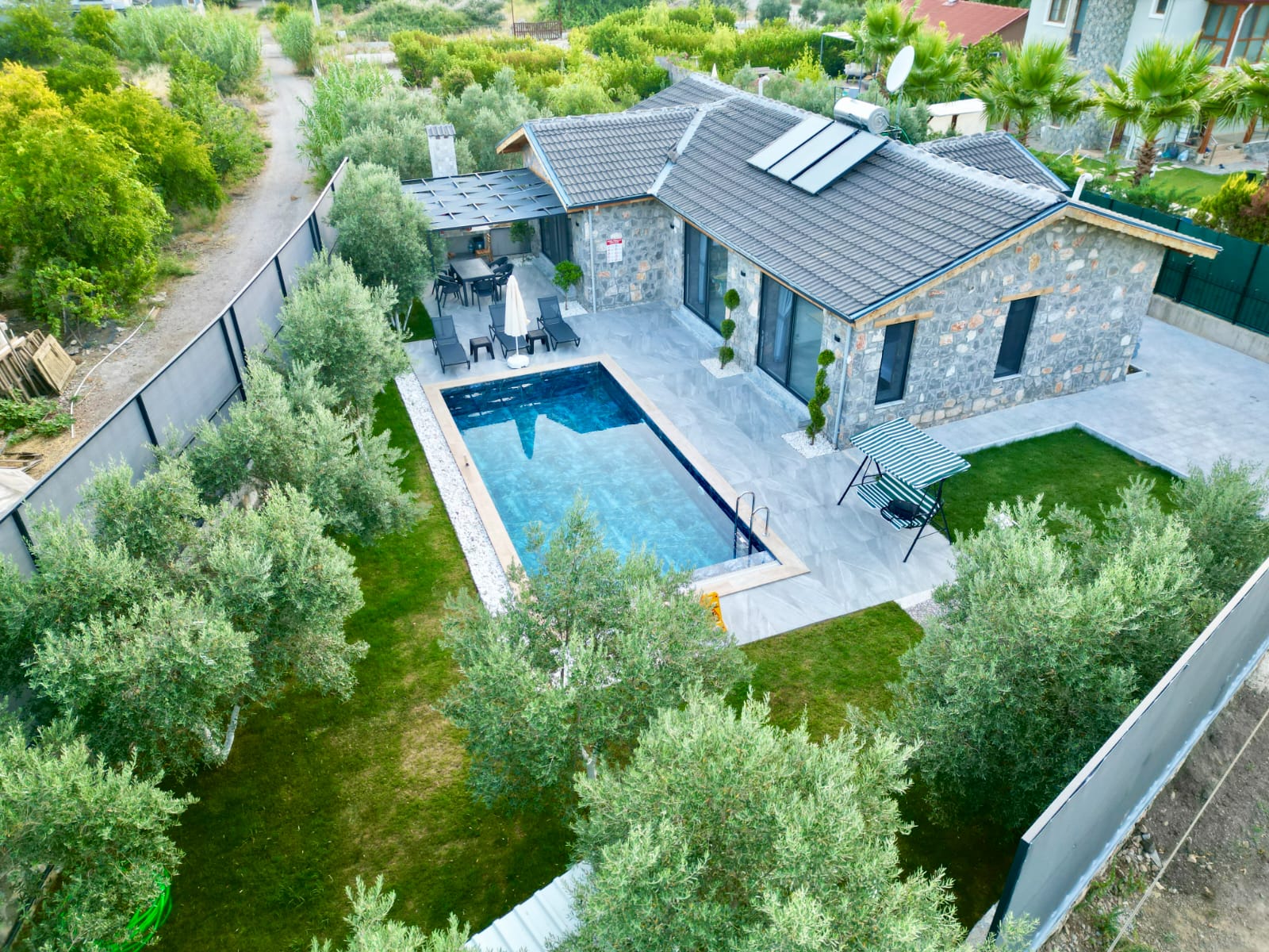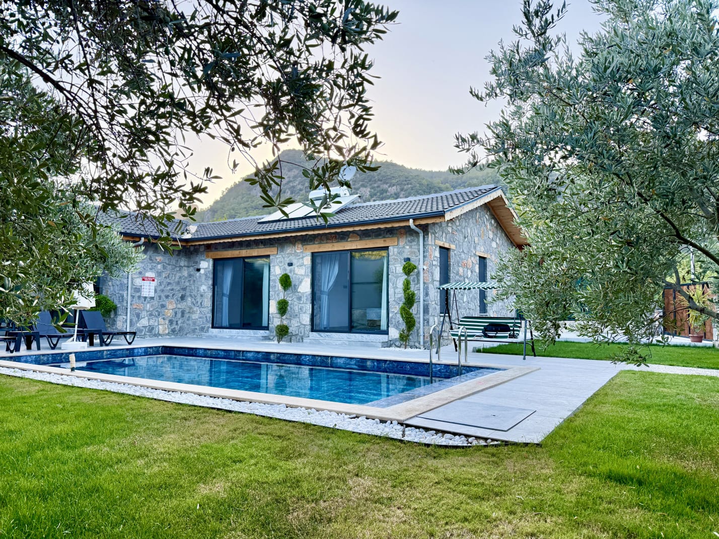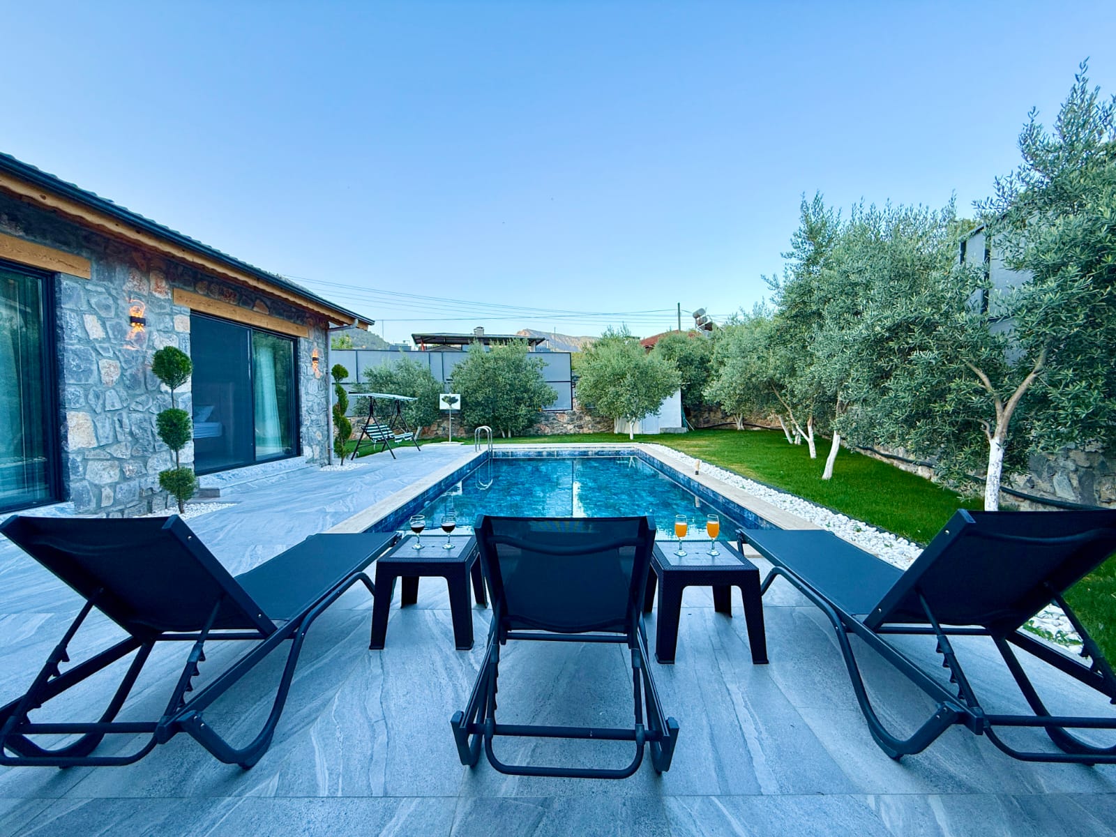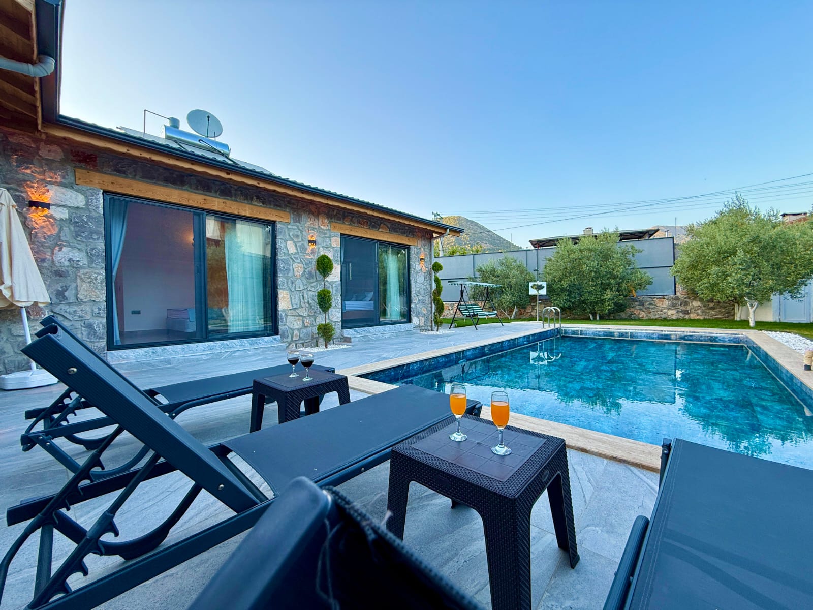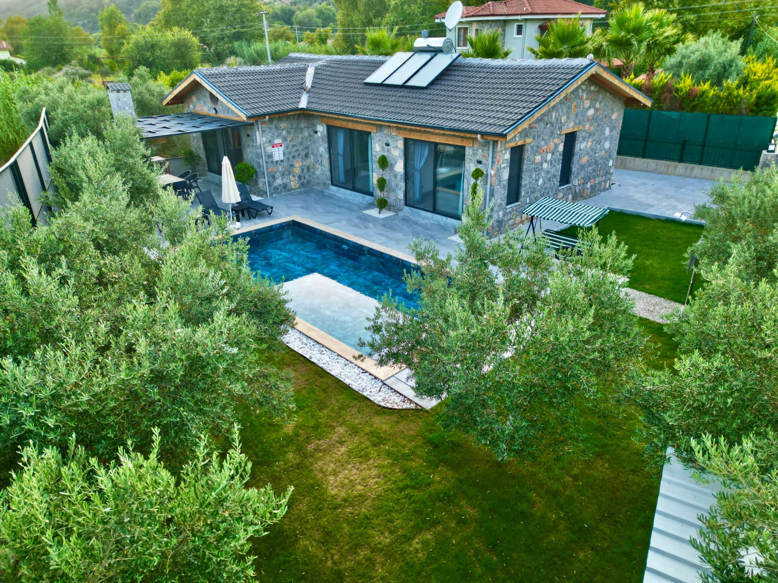 Geniş ve yemyeşil bahçe içerisinde yer alan özel yüzme havuzu 3x7 metre ölçülerindedir. Özellikle akşam saatlerinde aydınlatmasıyla birlikte ortaya çıkan ambiyans, villada geçirilen zamanı daha keyifli ve özel hale getirir. Doğa ile iç içe konumu sayesinde temiz hava, sakinlik ve huzur ön plandadır.