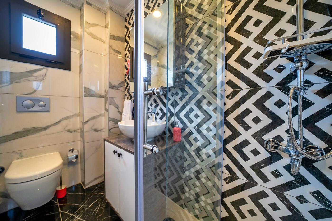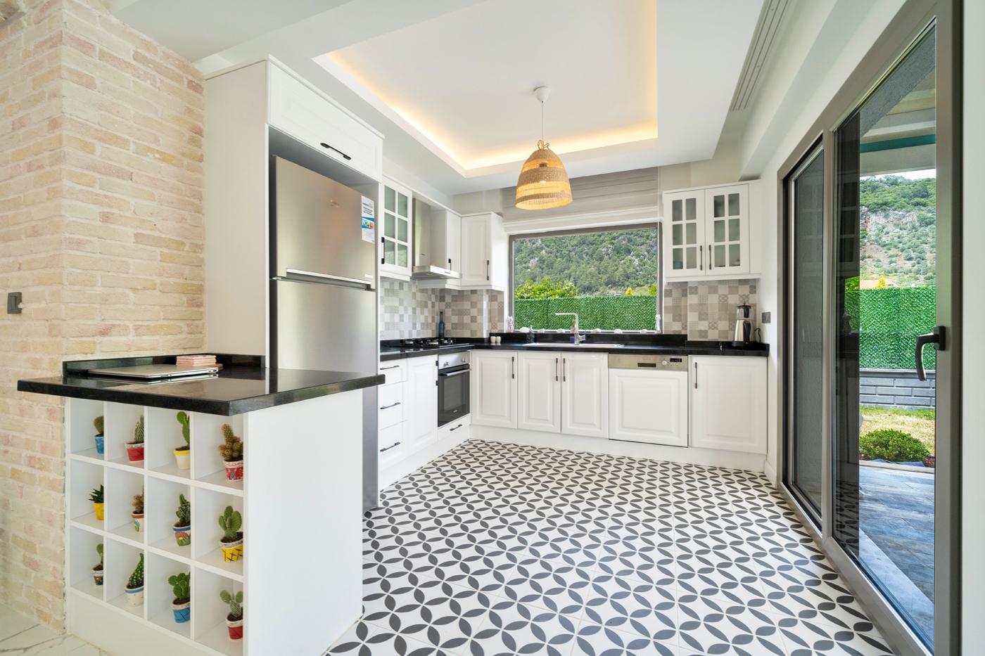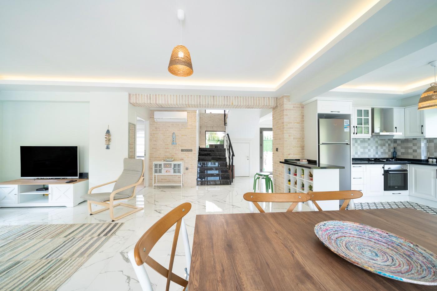 Modern ve şık bir şekilde dizayn edilmiş açık mutfak ve aydınlık salon, gün boyu doğal ışık alan yapısıyla ferah bir atmosfer sunarken; geniş odalar ve cumbalı mimari detaylar, villaya karakteristik ve sıcak bir hava katıyor. Toplamda 3.5 banyo/WC bulunan villa, konaklama süresince maksimum konforu garanti ediyor.